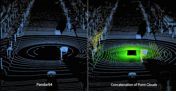 圖為:?jiǎn)我籔andar64點(diǎn)云(藍(lán))與Pandar64(藍(lán))+4個(gè)PandarQT(綠)拼接點(diǎn)云對(duì)比圖