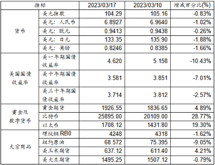 3月10日至3月17日,美元指數(shù)下跌0.83%,美元兌人民幣匯率下跌1.02%達到1:6.8927。美國一年期、十年期以及三十年其國債收益率均出現(xiàn)下跌。黃金期貨價格上漲4.89%。比特幣大漲28.77%。以太幣大漲19.30%。大宗商品中,螺紋鋼、紐約原油及大豆期貨價格均呈現(xiàn)下跌態(tài)勢,而玉米期貨價格則呈現(xiàn)上漲。