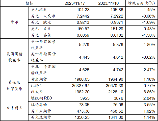 11月10日至11月17日,美元指數下跌1.45%,美元兌人民幣匯率下跌0.66%達到1:7.2442。美國一年期、十年及三十年國債收益率均下跌。黃金期貨價格上漲1.18%。比特幣下跌0.77%。以太幣下跌6.86%。大宗商品中,螺紋鋼、玉米期貨及大豆期貨價格上漲,而紐約原油價格出現下跌。