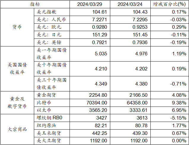 3月24日至3月29日,美元指數(shù)上漲0.17%,美元兌人民幣匯率下跌0.03%達(dá)到1:7.2271。美國一年期及十年期國債收率上漲,而三十年期國債收益率則有所下跌。黃金期貨價格上漲4.08%。比特幣上漲9.38%。以太幣上漲6.95%。大宗商品中,螺紋鋼價格下跌,而紐約原油及玉米期貨價格呈現(xiàn)上漲態(tài)勢。