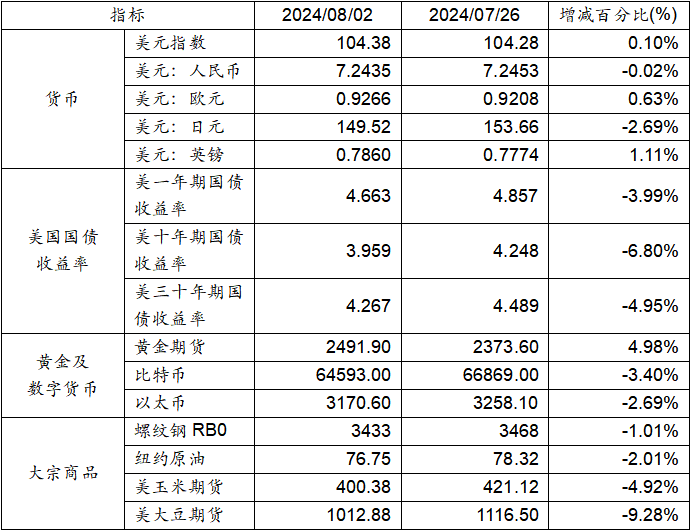 7月26日至8月2日,美元指數上漲0.10%,美元兌人民幣匯率下跌0.02%至1:7.2435。美國一年期、十年期及三十年期國債收益率均呈現下跌態勢。黃金期貨價格上漲4.98%。比特幣下跌3.40%。以太幣下跌2.69%。大宗商品中,玉米期貨、大豆期貨、螺紋鋼及紐約原油價格均呈現下跌態勢。
