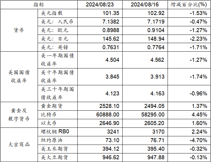 8月16日至8月23日,美元指數下跌1.53%,美元兌人民幣匯率下跌0.47%至1:7.1782。美國一年期、十年期及三十年期國債收益率呈現下跌態勢。黃金期貨價格上漲1.37%。比特幣上漲4.45%。以太幣上漲1.60%。大宗商品中螺紋鋼價格上漲,而玉米期貨、大豆期貨及紐約原油價格均呈現下跌態勢。