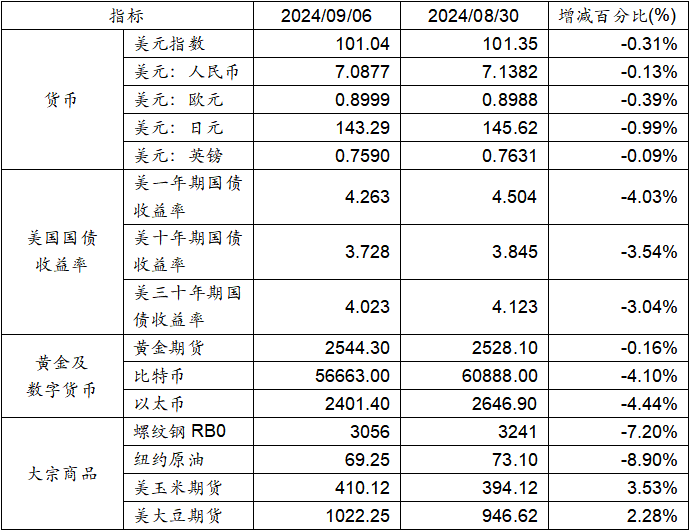 8月30日至9月6日,美元指數(shù)下跌0.31%,美元兌人民幣匯率下跌0.13%至1:7.0877。美國(guó)一年期、十年期及三十年其國(guó)債收益率均呈現(xiàn)下跌態(tài)勢(shì)。黃金期貨價(jià)格下跌0.16%。比特幣下跌4.10%。以太幣下跌4.44%。大宗商品中螺紋鋼及紐約原油價(jià)格下跌,而玉米期貨及大豆期貨價(jià)格均呈現(xiàn)上漲態(tài)勢(shì)。