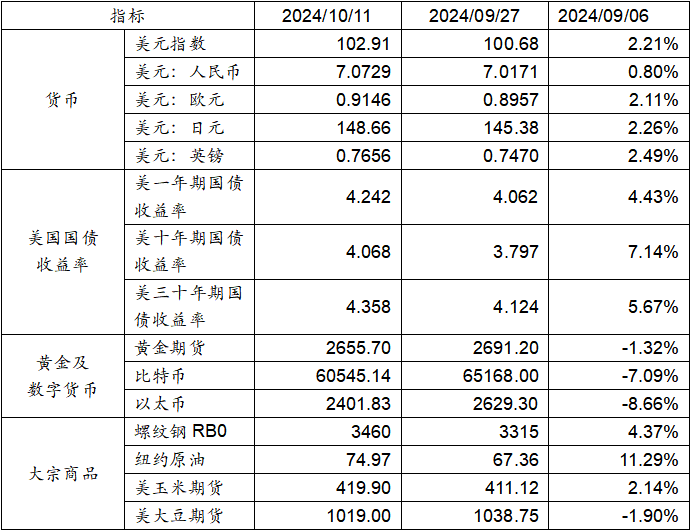 9月27日至10月11日,美元指數上漲2.21%,美元兌人民幣匯率上漲0.80%至1:7.0729。美國一年期國債、十年期及三十年期國債收益率均呈現上漲態勢。黃金期貨價格下跌1.32%。比特幣下跌7.09%。以太幣下跌8.66%。大宗商品中螺紋鋼、紐約原油及玉米期貨價格上漲,而大豆期貨價格則呈現下跌態勢。