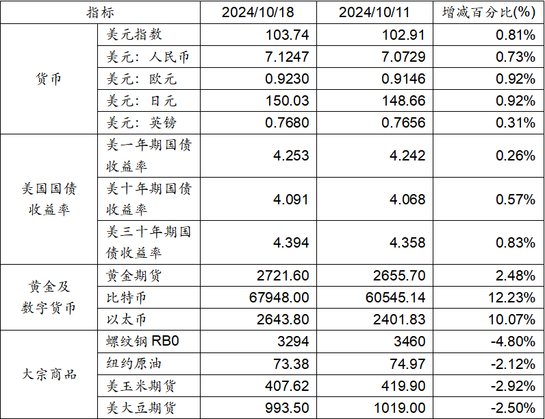 10月11日至10月18日,美元指數(shù)上漲0.81%,美元兌人民幣匯率上漲0.73%至1:7.1247。美國一年期國債、十年期及三十年期國債收益率均呈現(xiàn)上漲態(tài)勢。黃金期貨價格上漲2.48%。比特幣大漲12.23%。以太幣大漲10.07%。大宗商品中螺紋鋼、紐約原油、玉米期貨及大豆期貨價格均下跌。