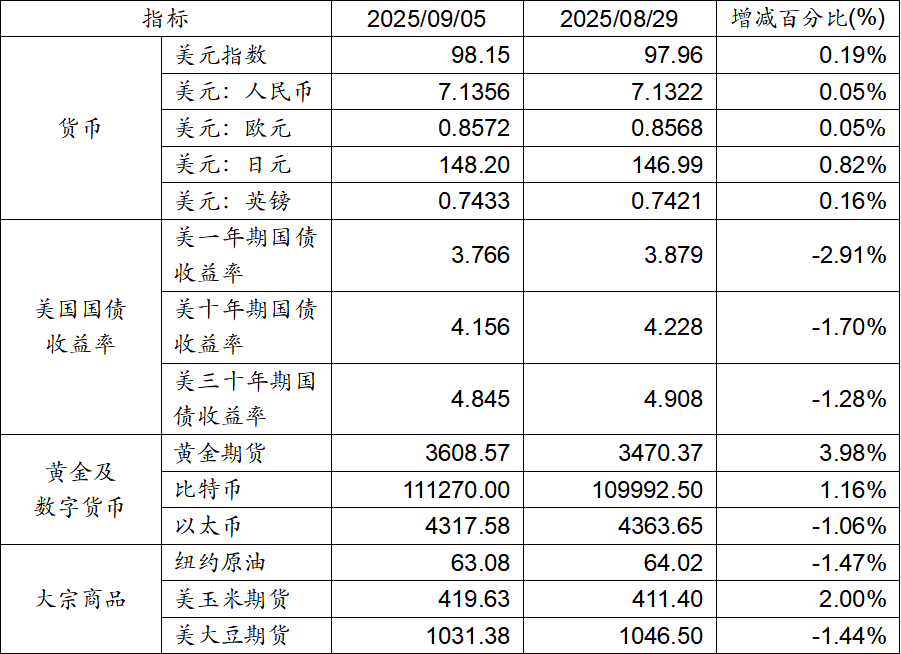 8月29日至9月5日,美元指數(shù)上漲0.19%,美元兌人民幣匯率上漲0.05%。美國一年期、十年期及三十年期國債收益率均呈現(xiàn)下降態(tài)勢。黃金期貨價(jià)格上漲3.98%。比特幣上漲1.16%。以太幣下跌1.06%。大宗商品玉米期貨價(jià)格上漲,而紐約原油及大豆期貨價(jià)格則呈現(xiàn)下跌態(tài)勢。