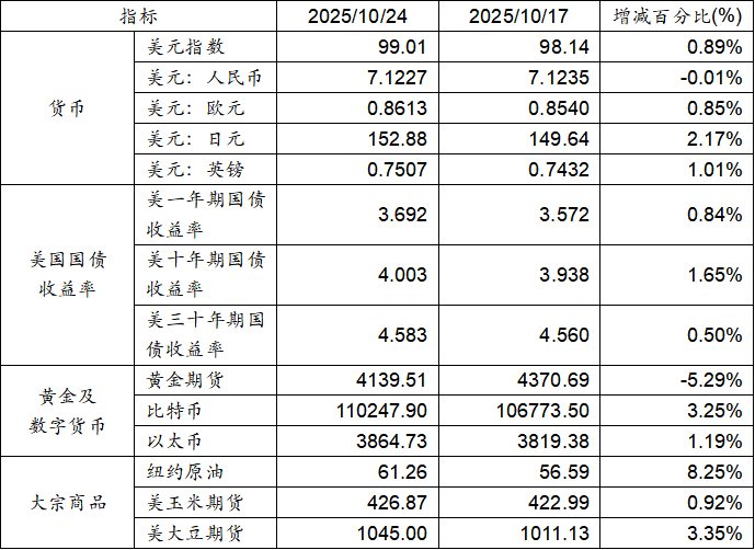 10月17日至10月24日,美元指數上漲0.89%,美元兌人民幣匯率下跌0.01%。美國一年期、十年期及三十年期國債收益率均呈現上漲態勢。黃金期貨價格下跌5.29%。比特幣上漲3.25%。以太幣上漲1.19%。大宗商品中紐約原油價格下跌,而大豆期貨及玉米期貨價格呈現上漲態勢。